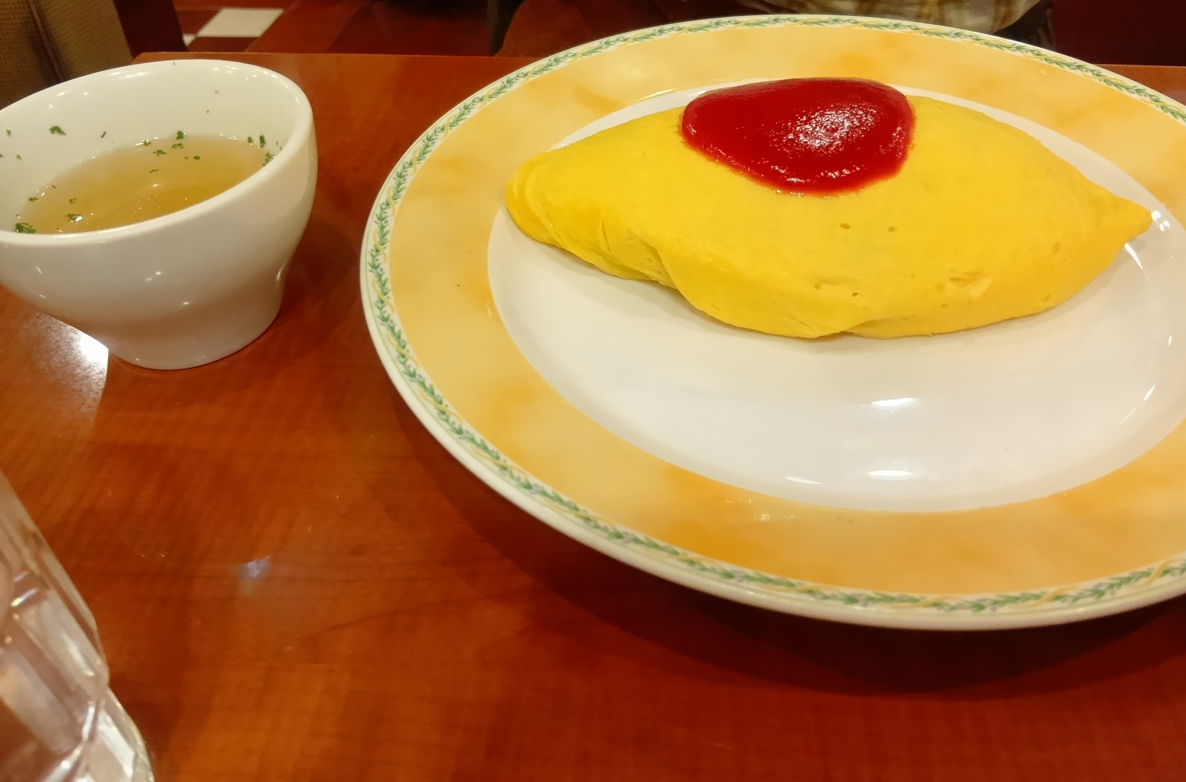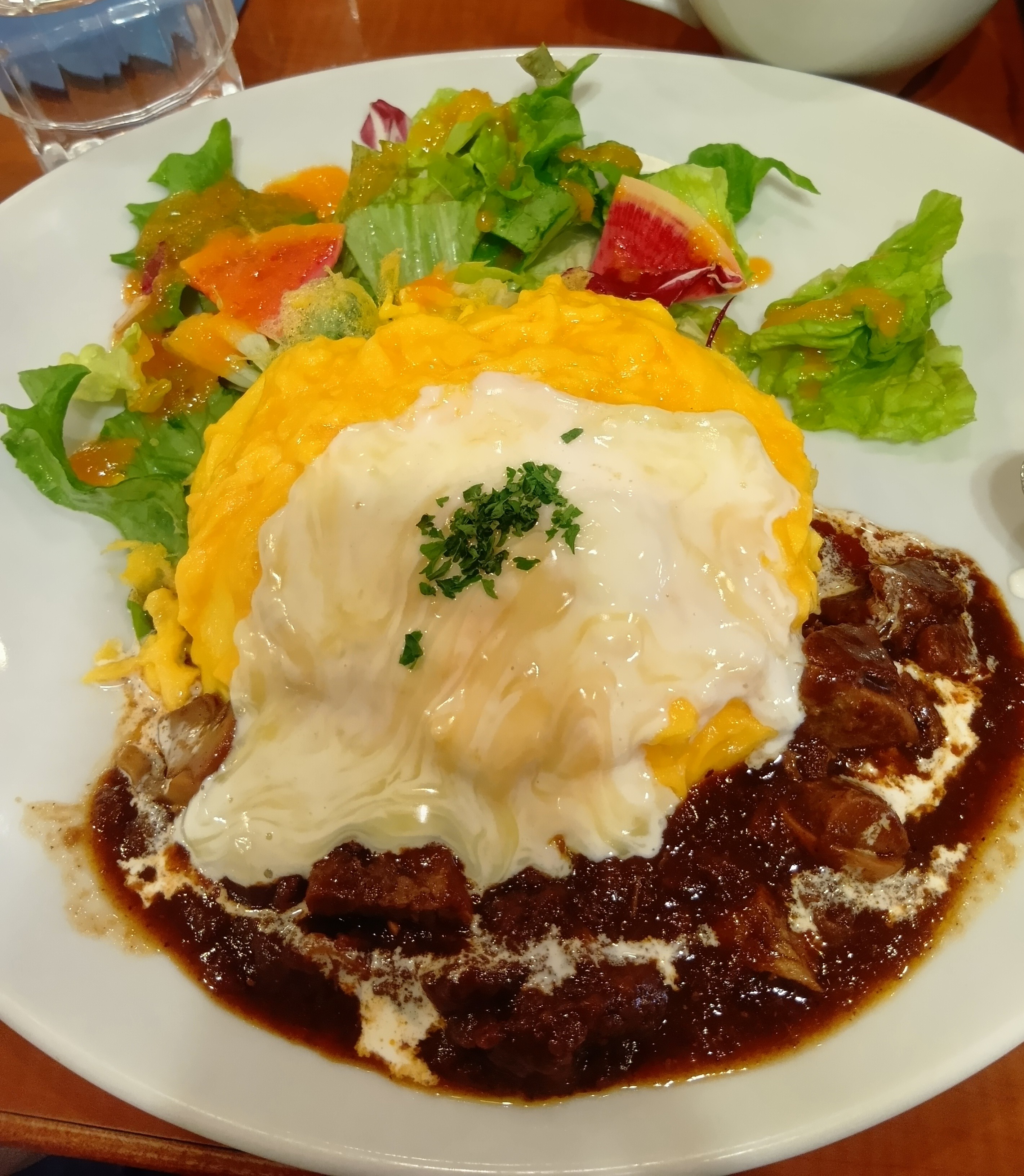 お昼はオムライス屋さんに行きました。アニメみたいなオムライス出てきた!!